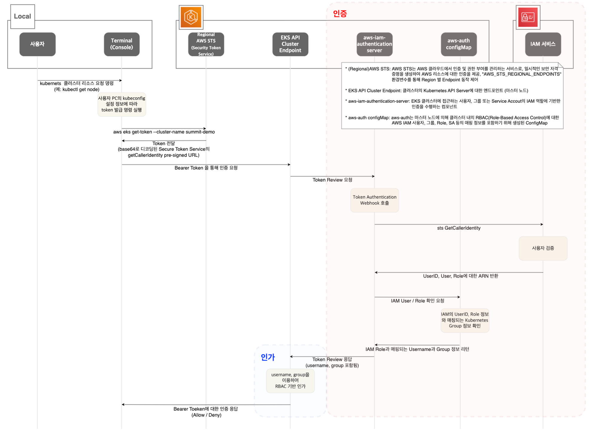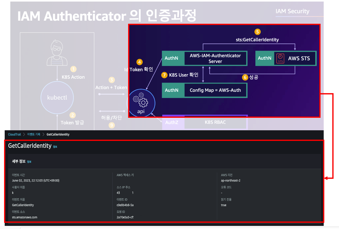 EKS 인증을 위해 발생하는 일련의 과정을 나타낸 그림입니다.