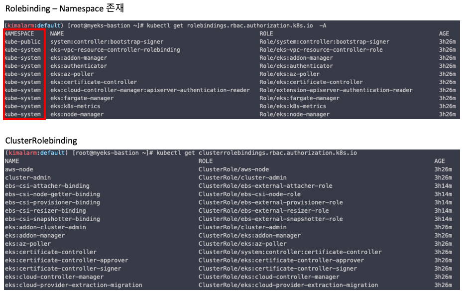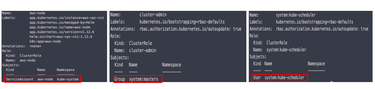 모두 Clusterrolebinding 이지만, 주체는 각각 Service Account, User, Group 으로 구성된 것을 알 수 있습니다.