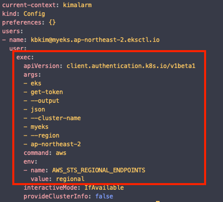 해당 config 파일을 보면 kubectl 사용자에 대해 AWS CLI 명령어를 수행하도록 설정되어 있습니다.