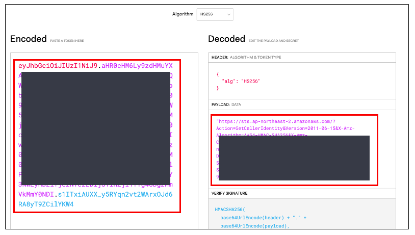 JWT 사이트에서 해당 토큰을 Decode 해보면 EKS API Server 에 전송하는 API 가 나타납니다.