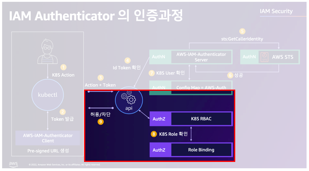 - 인증(Authentication) : 외부 사용자가 EKS Cluster 에 접속하는 과정 (AWS IAM 사용)