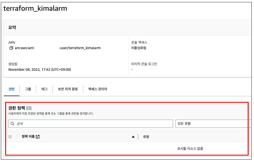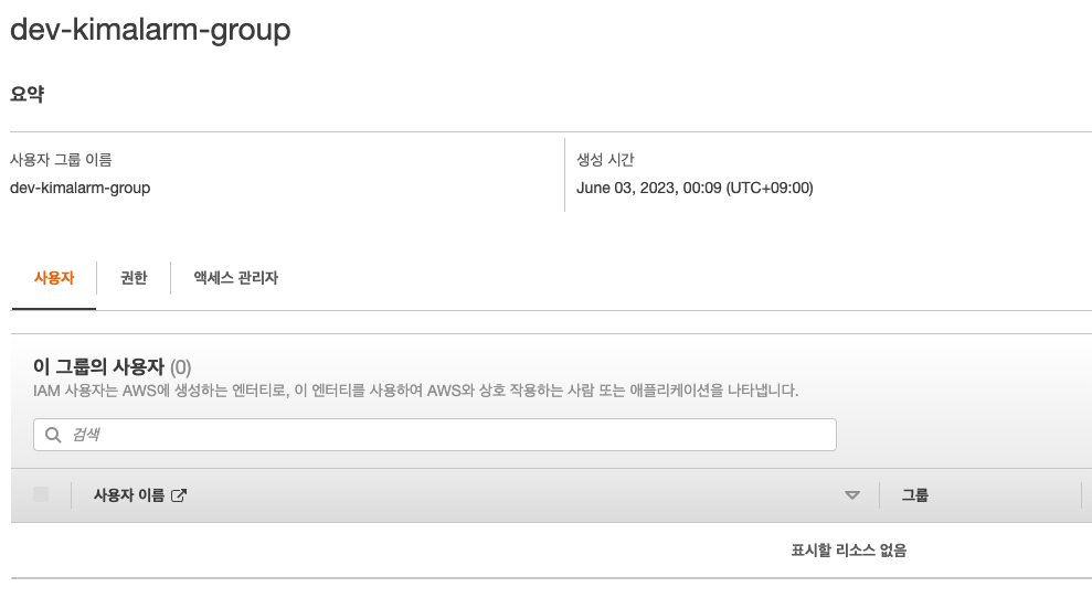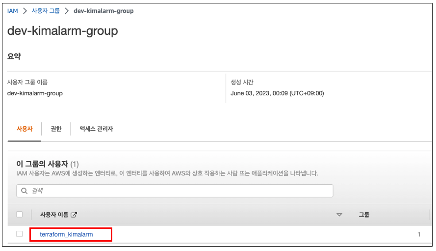 IAM Group 에 속해있지 않은 사용자를 테스트 하기 위해 기존 terraform_kimalarm 유저를 IAM Group 에서 제거합니다.