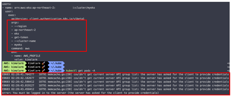 이후 다시 아래 명령어를 통해 EKS 접속을 시도해봅니다.