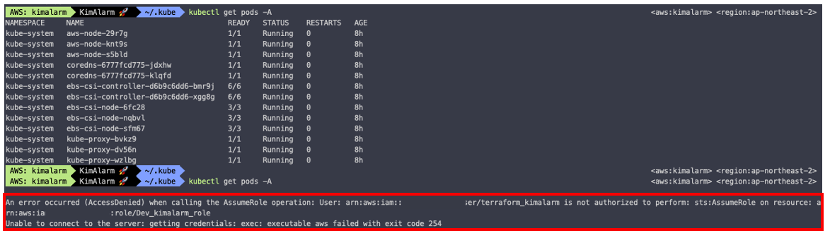 이 방법은 아무 권한이 없는 terraform_kimalarm 유저가 EKS 인증을 시도하고 있기 때문입니다.