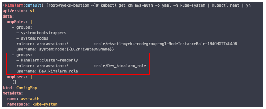 정상적으로 수행되었다면 aws-auth 에서 다음과 같은 역할이 매핑되어 있습니다.
