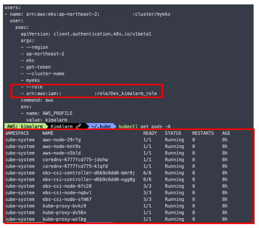 aws eks --region ap-northeast-2 update-kubeconfig --name myeks --role-arn <DEV_IAM_ROLE_ARN>