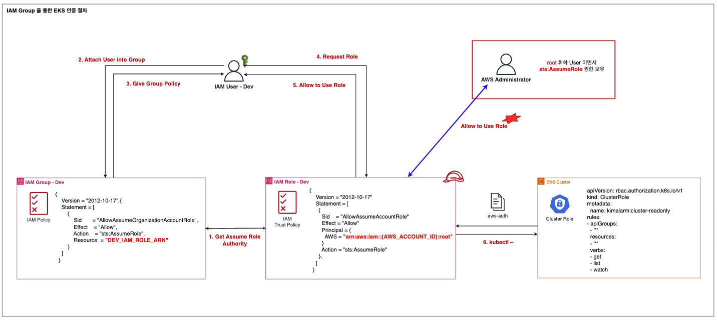 앞서 알 수 있듯이, AssumeRole 을 통해 IAM Group 에서 EKS 인증과 관련된 사용자를 관리할 수 있습니다.