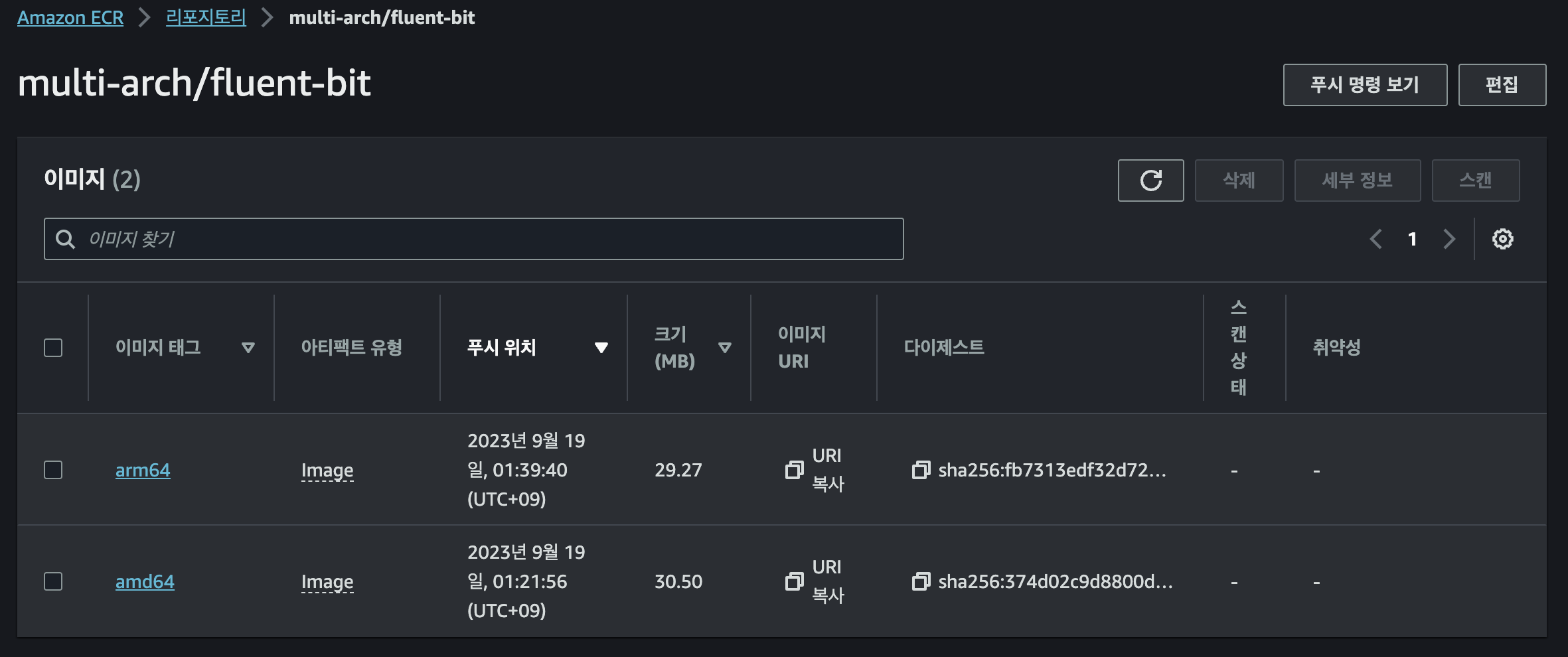 우선 ECR Repository 에 사용할 amd, arm 2개의 Image 를 업로드 해줍니다.