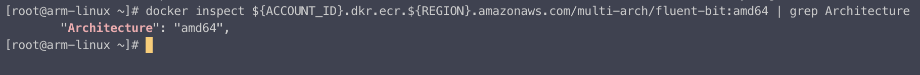 docker inspect ${ACCOUNT_ID}.dkr.ecr.${REGION}.amazonaws.com/multi-arch/fluent-bit:amd64 | grep Architecture