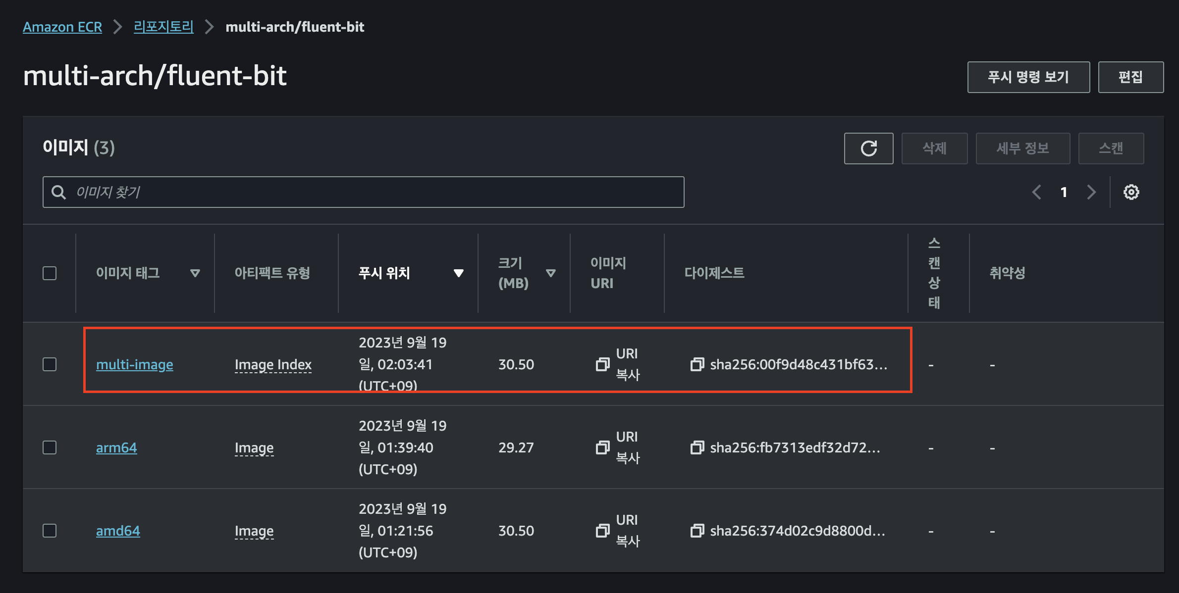 Private ECR Repo 명은 multi-arch/fluent-bit 으로 진행했습니다.