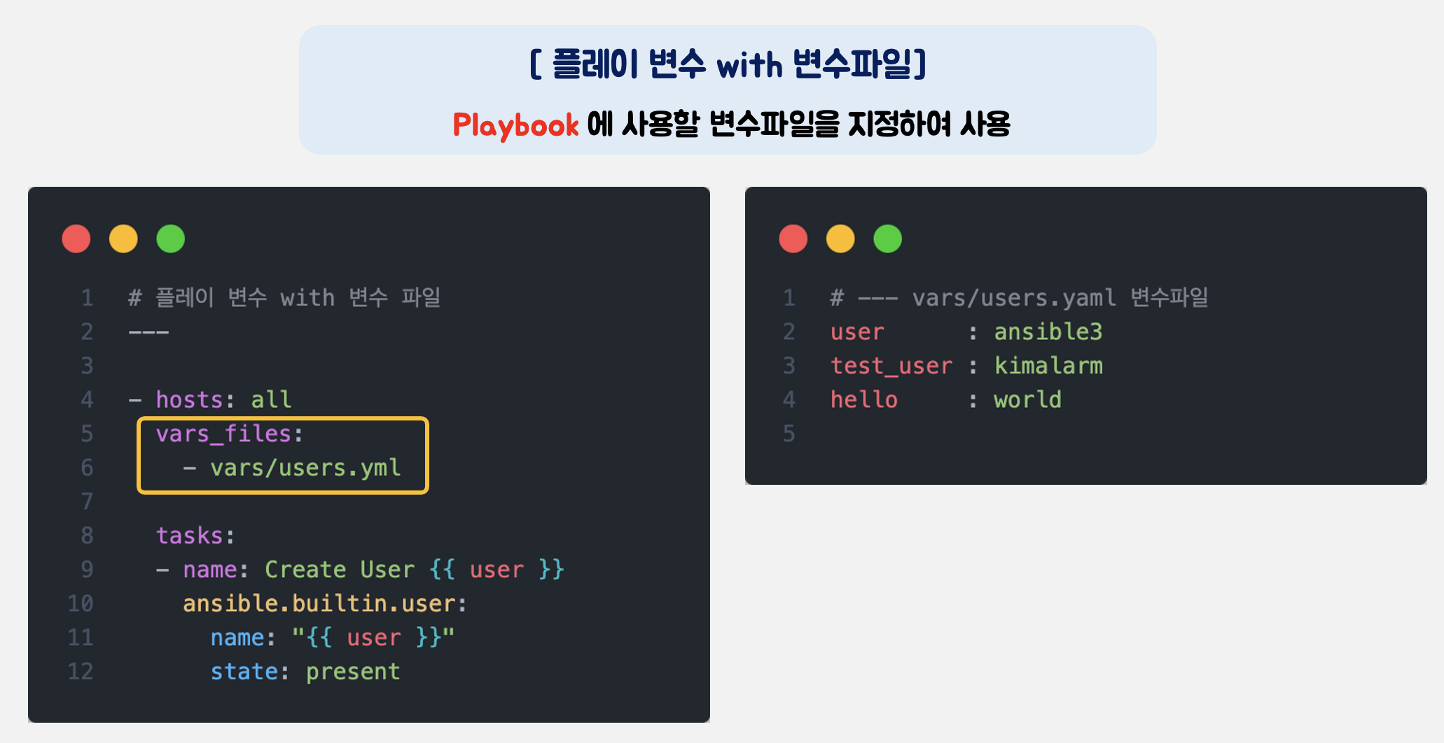- 플레이북에 직접 선언하여 사용하며, 변수를 별도의 파일로 분리하여 관리할 수 있습니다.