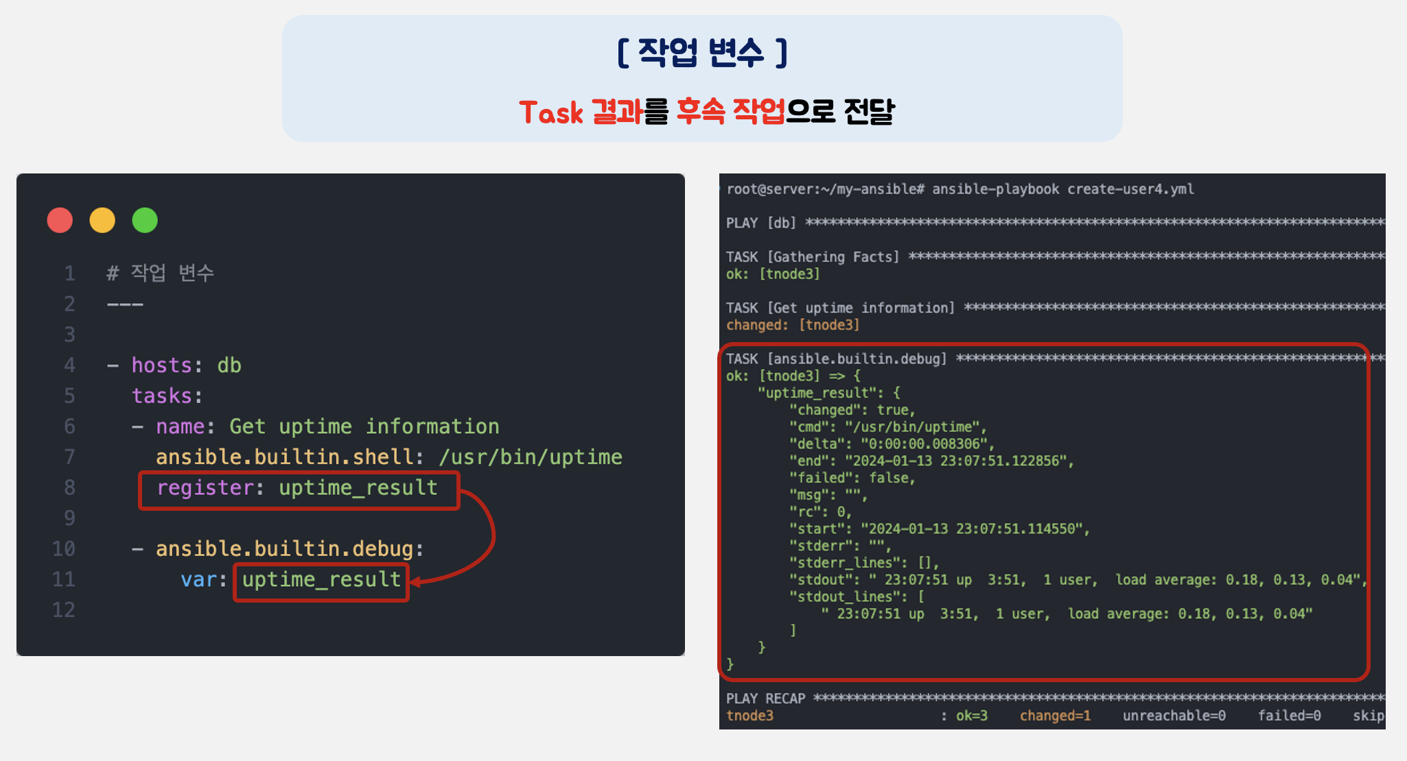 - 플레이북의 특정 작업(task) 를 수행하고 그 결과를 후속 작업에서 사용할 때 사용되는 변수입니다.