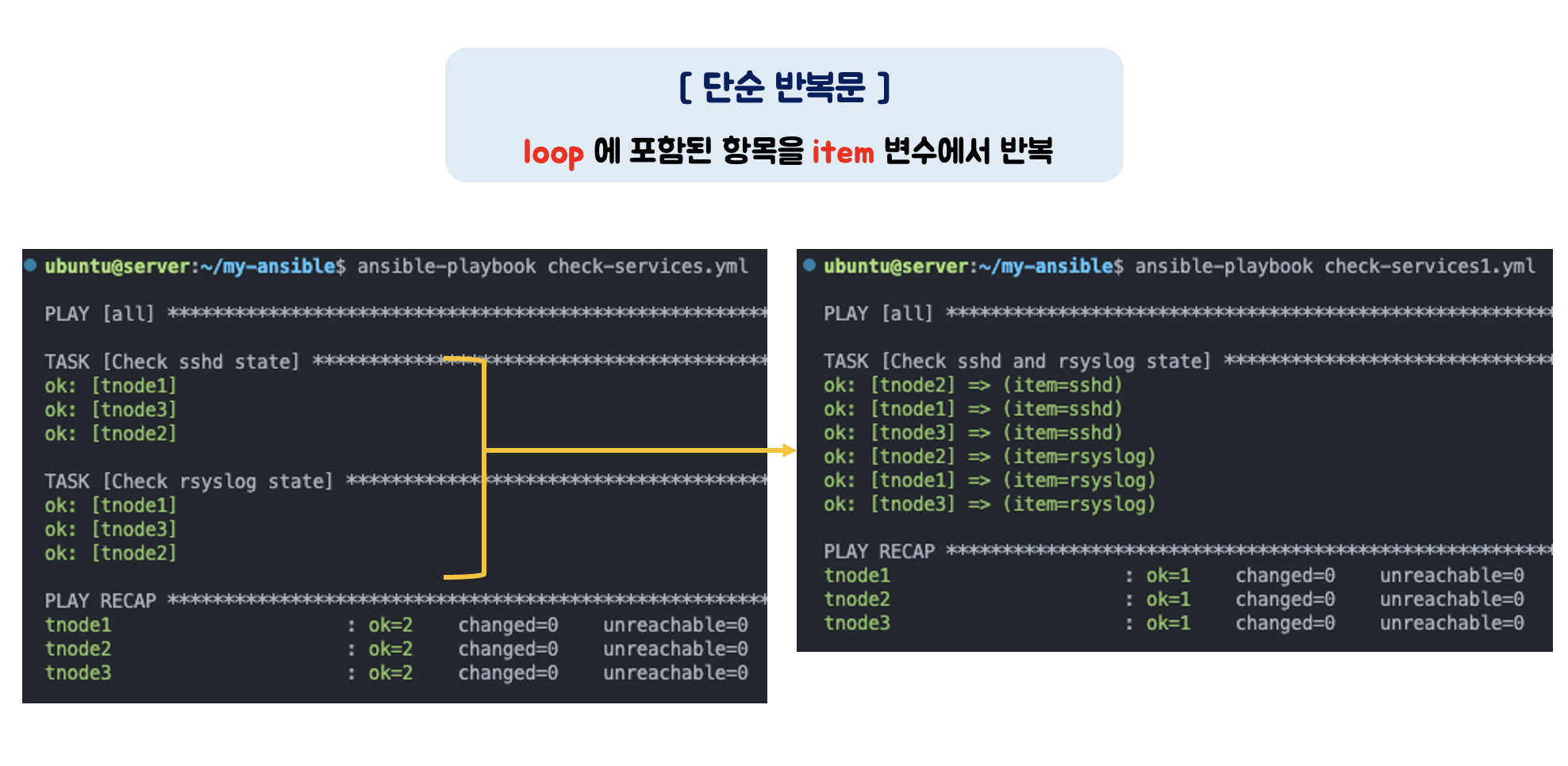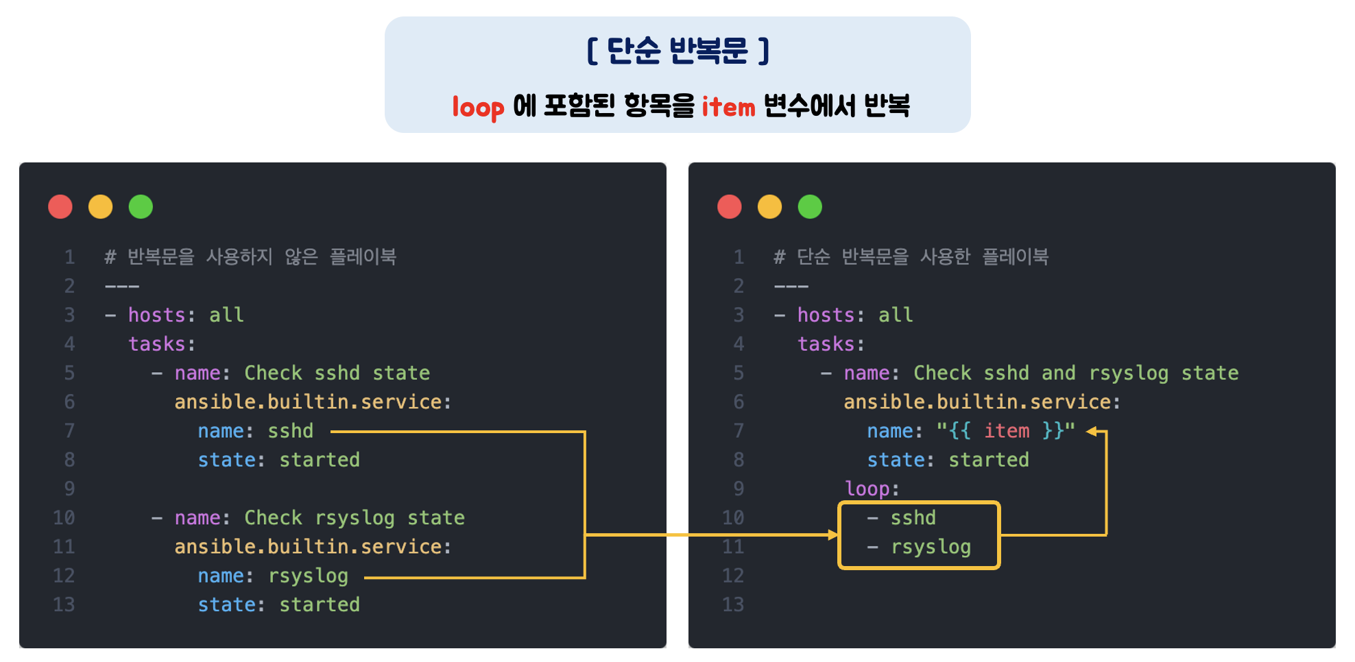 앤서블에서는 반복하는 아이템의 유형에 따라 '단순 반복문' 과 '사전 목록에 의한 반복문' 으로 나뉠 수 있고,
