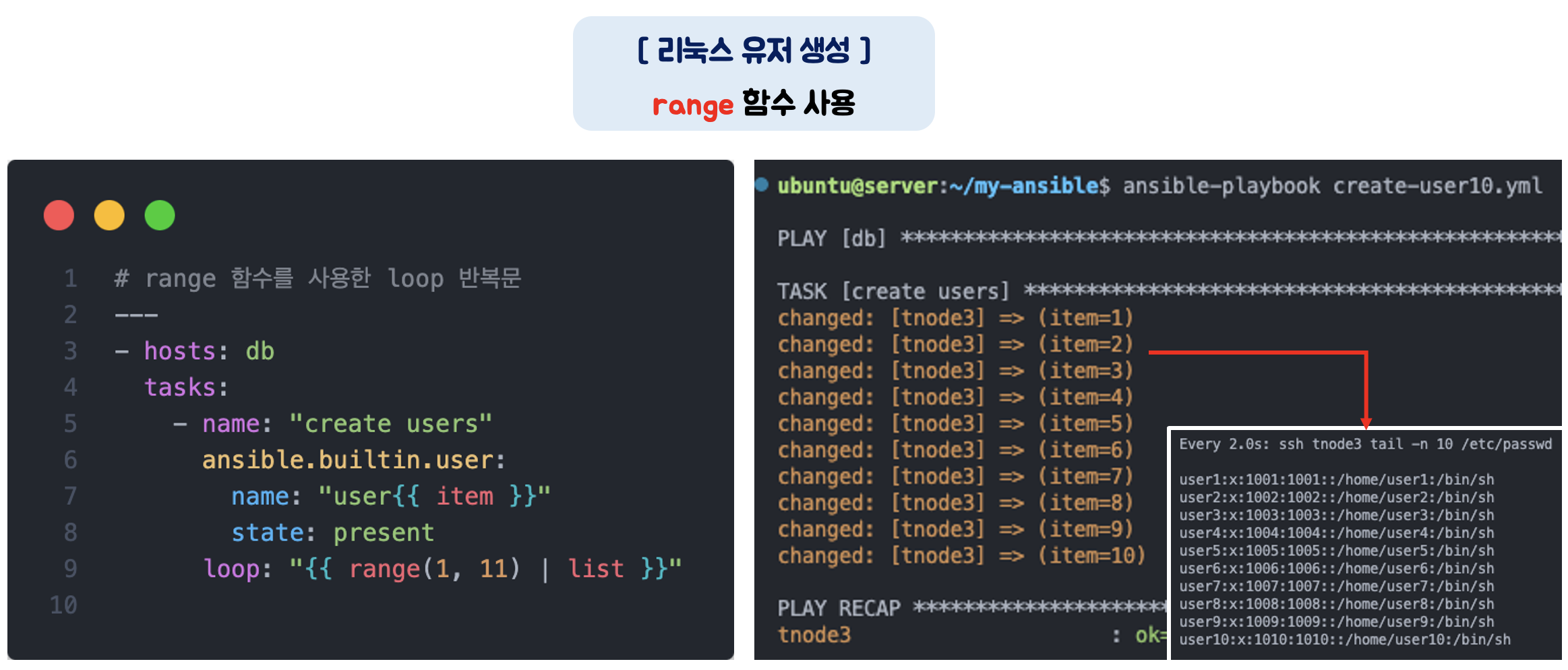 이런 경우, Ansible 에서 Loop 라는 키워드를 통해 반복문을 사용하면 더욱 효율적으로 플레이북을 작성할 수 있습니다.