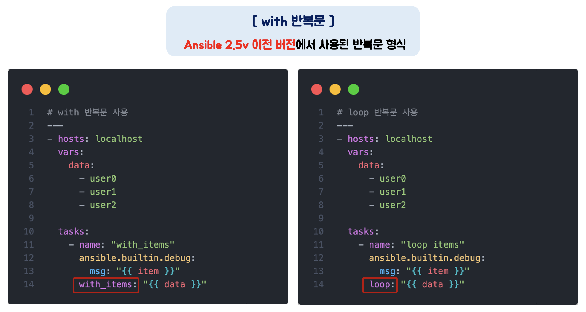 다만, 'with 반복문' 으로 작성된 플레이북을 분석해야 하는 경우도 있어 'with 반복문'도 알아두시면 도움이 될 것입니다.