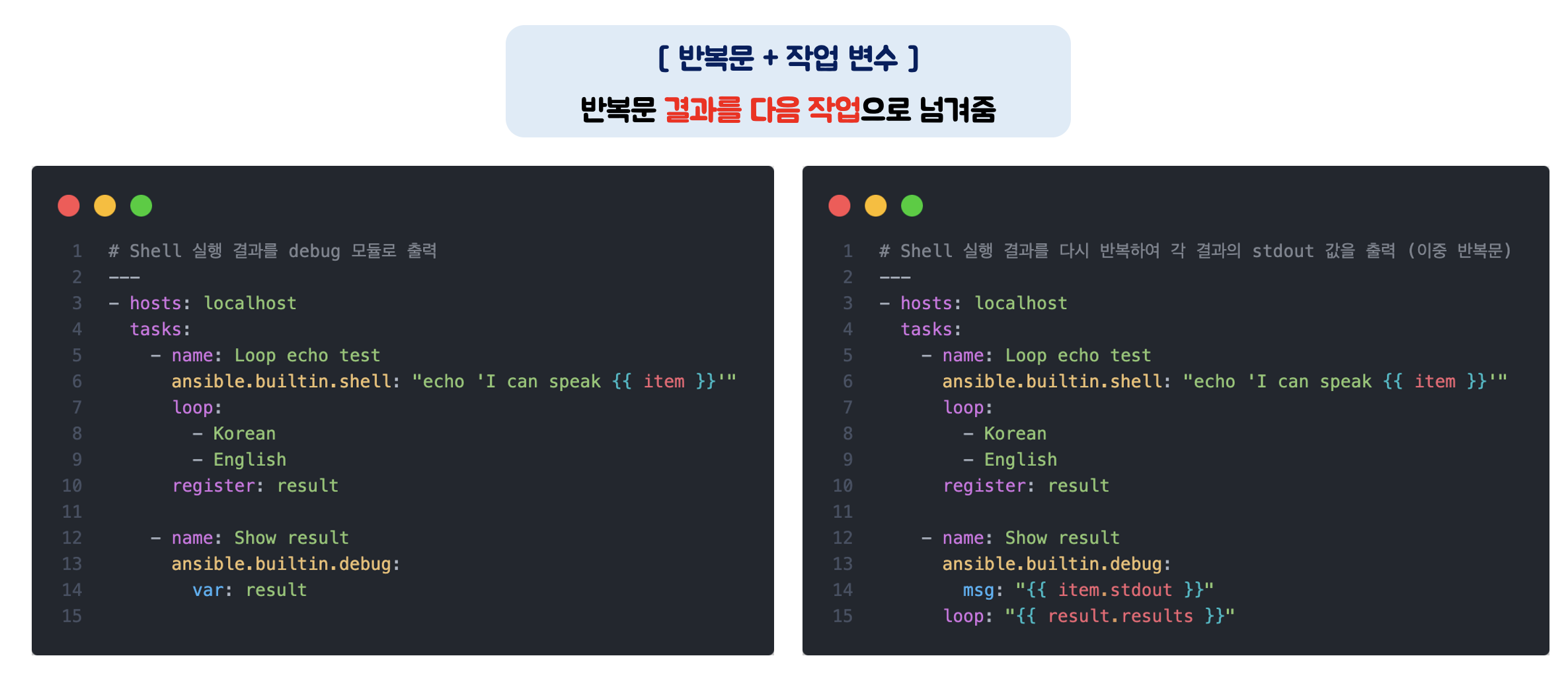 또한, 앞서 알아보았던 앤서블 작업 변수 (Register) 와 반복문을 함께 사용하여 반복문을 디버깅하거나 이중 반복문을 작성할 수도 있습니다.