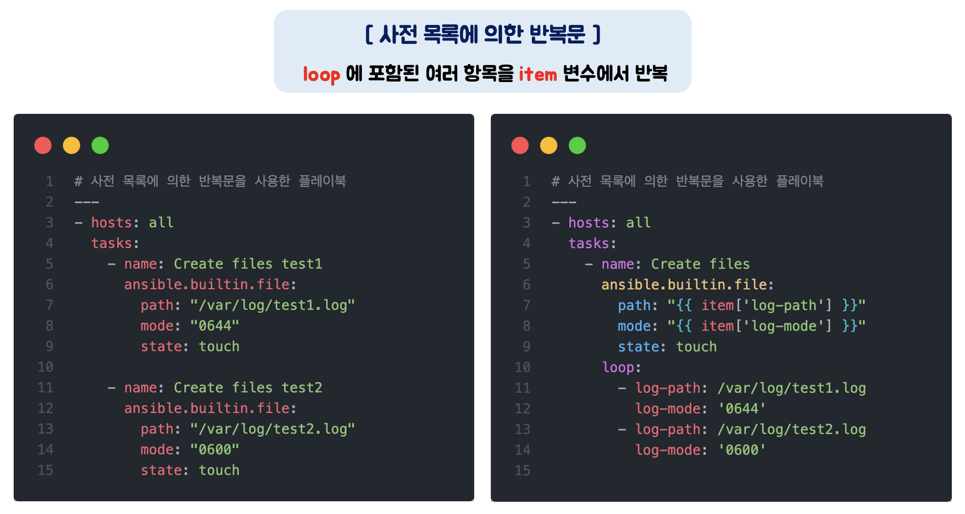 - 아래 플레이북처럼 loop 에 들어가는 항목을 별도의 변수로 선언하거나 변수 파일로도 사용할 수 있습니다.