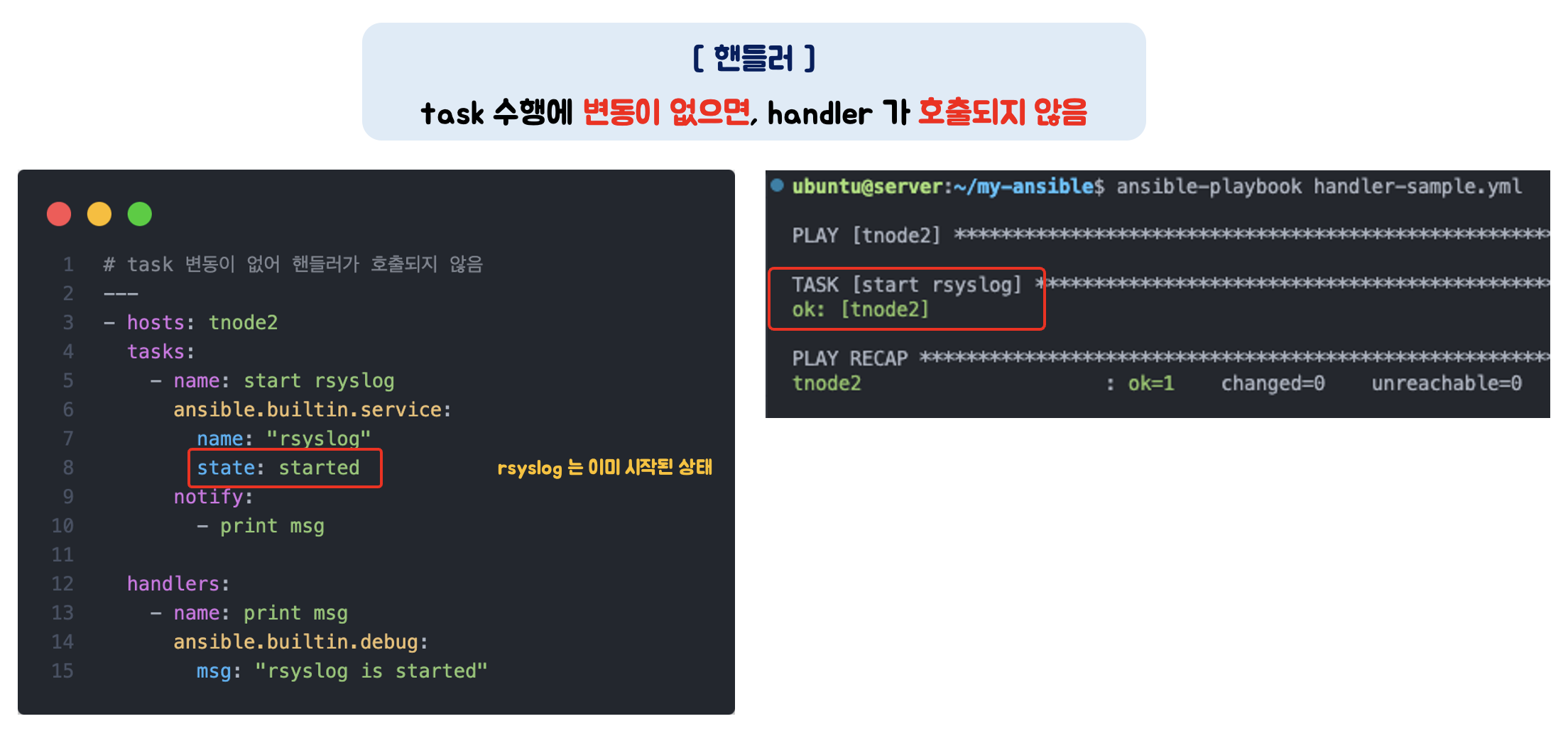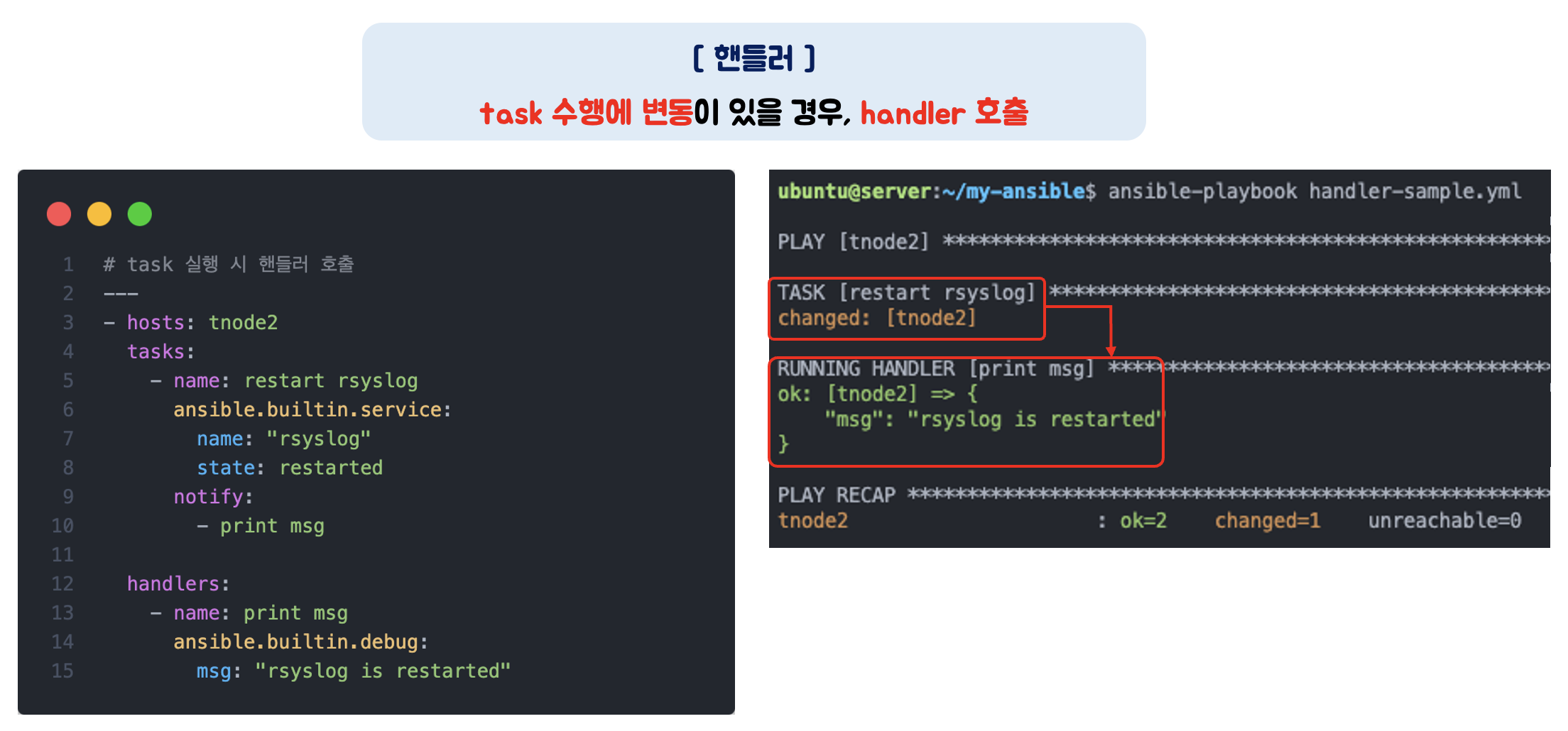 - service 모듈을 사용하여 'rsyslog' 를 재시작하는 Task 가 존재하며, 이 작업에 변화가 있을 경우 핸들러를 호출합니다.