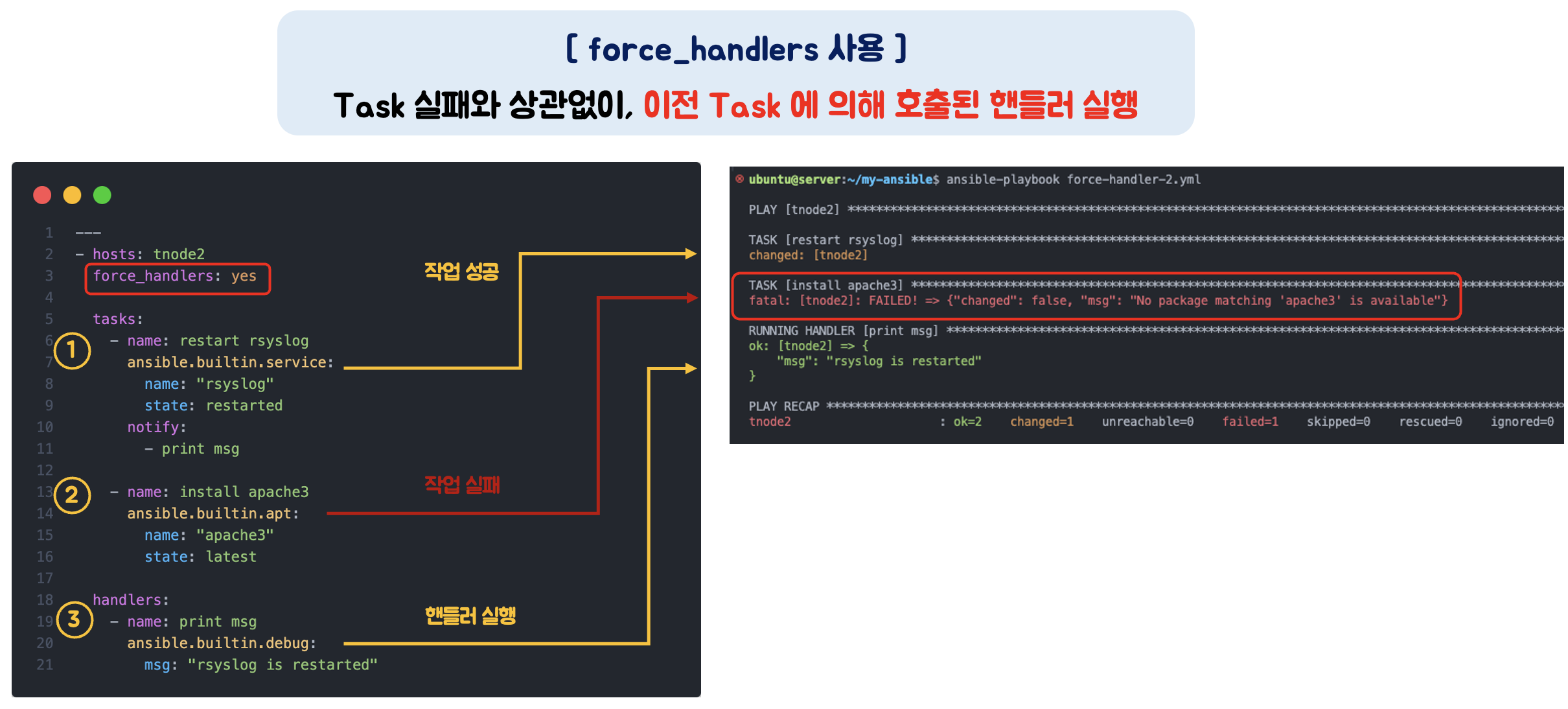 하지만, 'force_handlers: yes' 키워드 설정을 통해 작업이 실패하여도 핸들러를 호출할 수 있습니다.