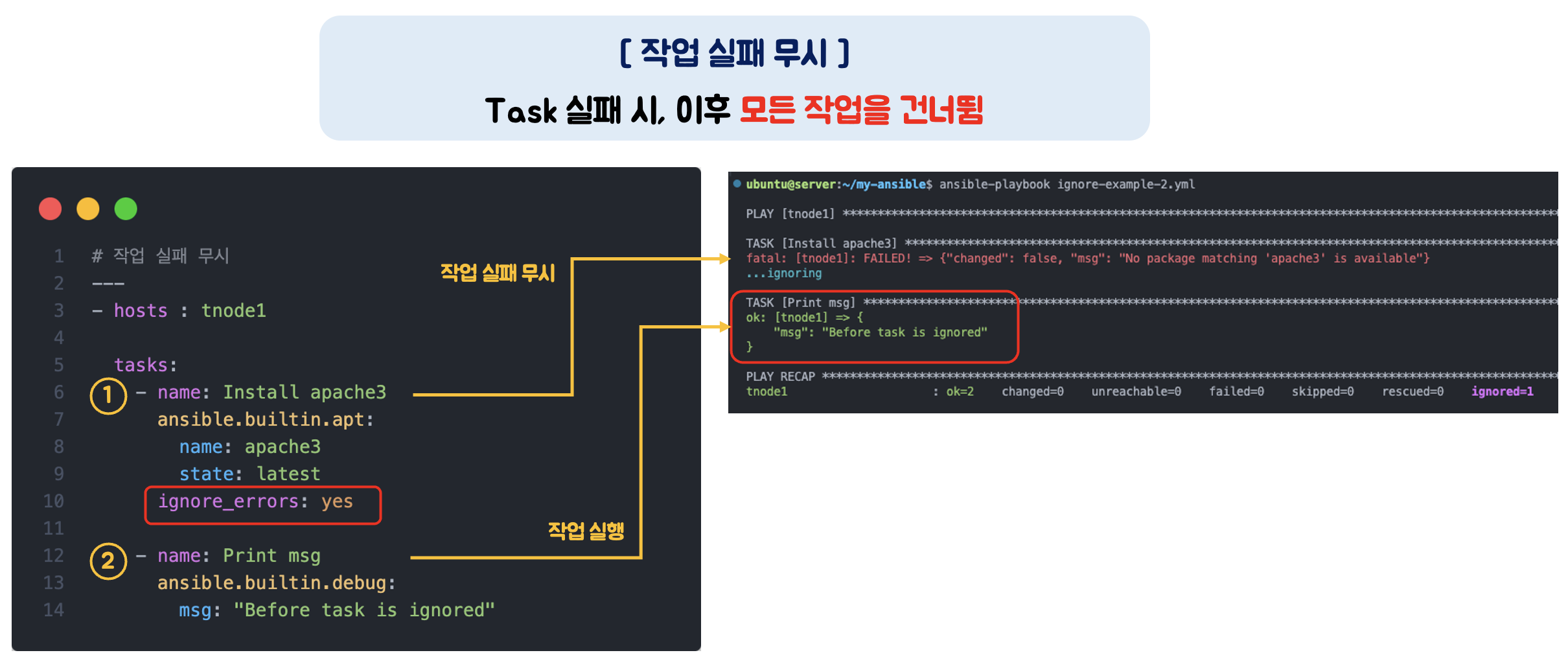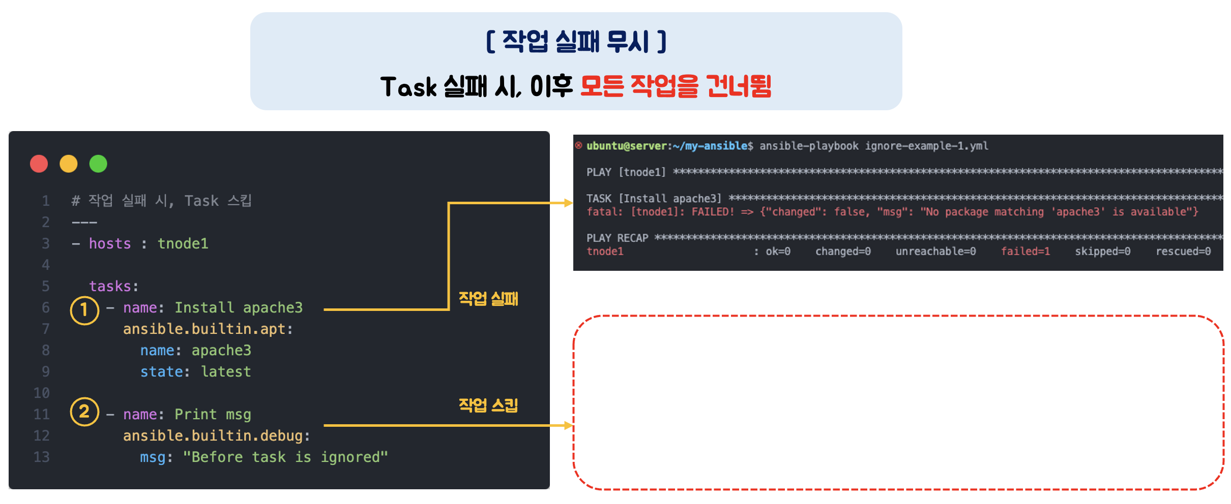 하지만, 'ignore_errors' 키워드를 통해 작업이 실패해도 플레이를 계속 실행할 수 있습니다.