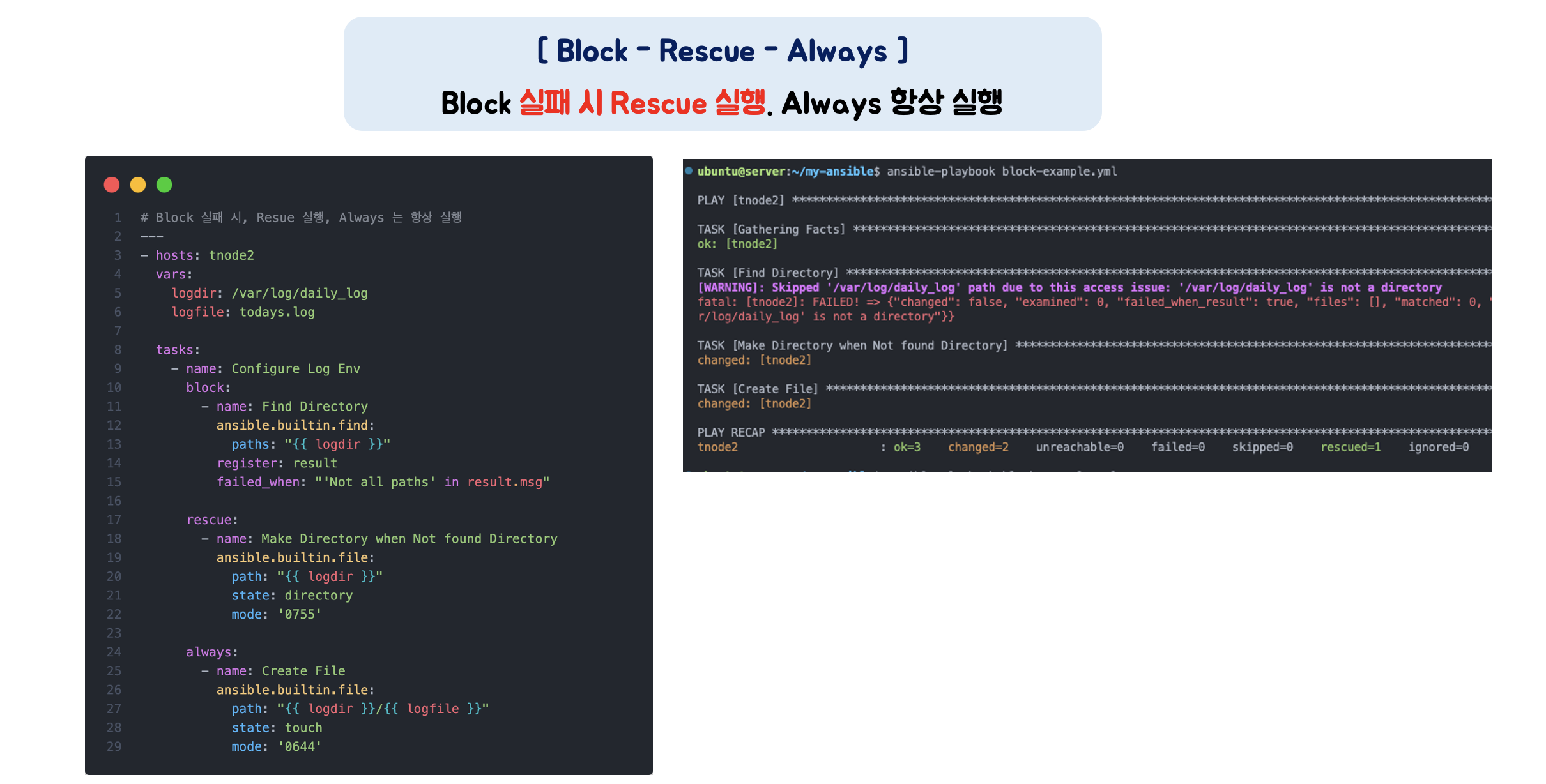 앤서블은 블록 (block) 이라는 오류를 제어하는 문법을 제공합니다.