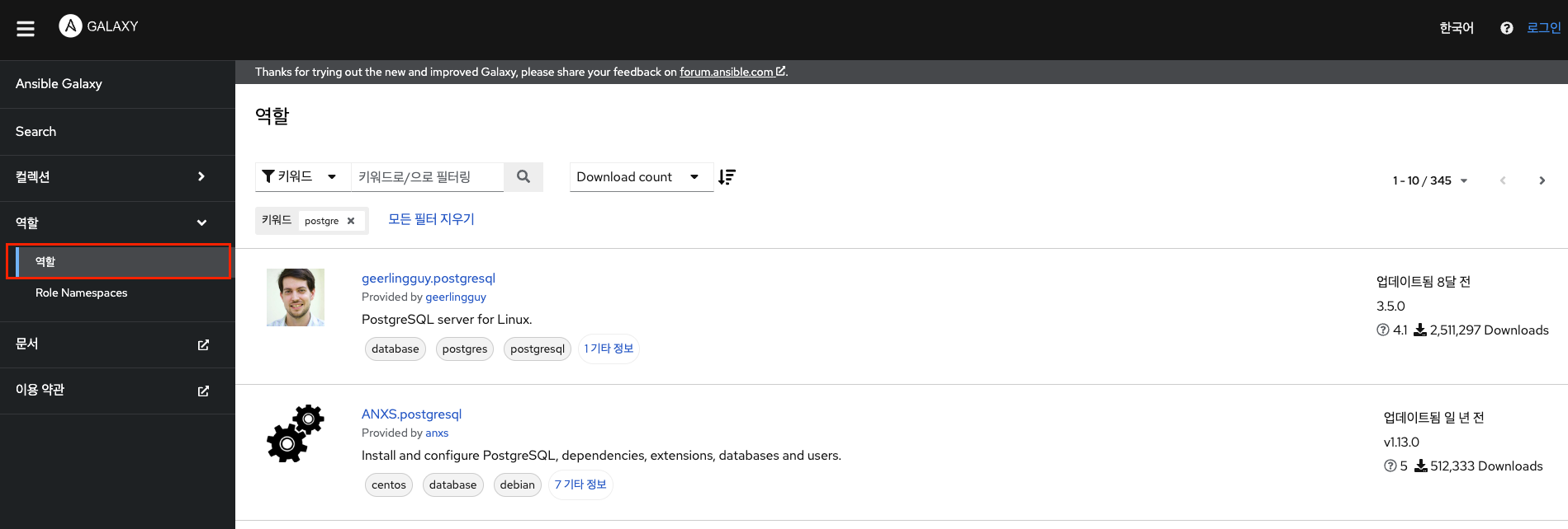 앤서블 갤럭시에서 롤 검색 후 다음 명령어로 롤을 설치할 수 있습니다.