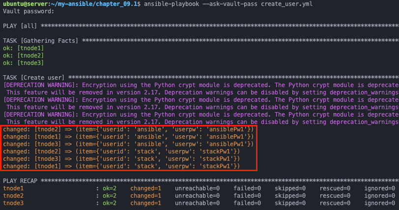 - 계정을 생성할 때는 ansible.builtin.user 모듈을, SSH 공개 키를 복사할 때는 ansible.posix.authorized_key 모듈을 이용한다.