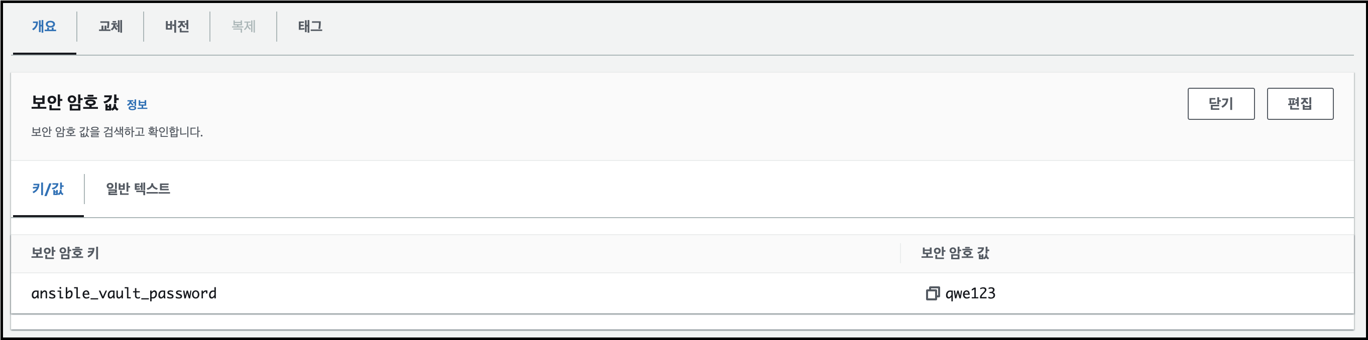 앤서블에서는 민감한 정보를 앤서블 Vault 를 통해 암호화 할 수 있습니다. 그리고 앤서블 Vault 암호화를 위한 암호를 AWS SecretManager 를 활용하여 저장 할 수 있습니다.
