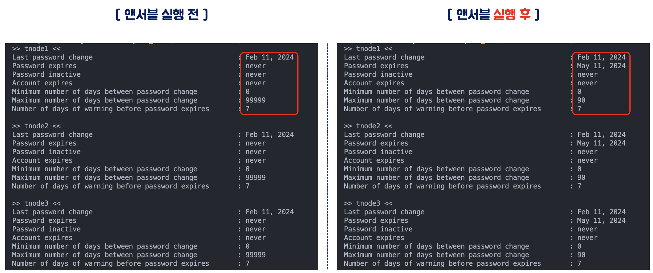 플레이북을 실행하기 전과 후의 비밀번호 변경 주기를 확인하면 변경 주기가 90일로 변경된 것을 알 수 있습니다.