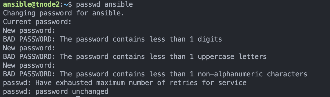 실제 대상 노드에 접근하여 조건에 맞지 않는 암호 변경 시 다음과 같은 오류를 확인할 수 있습니다.