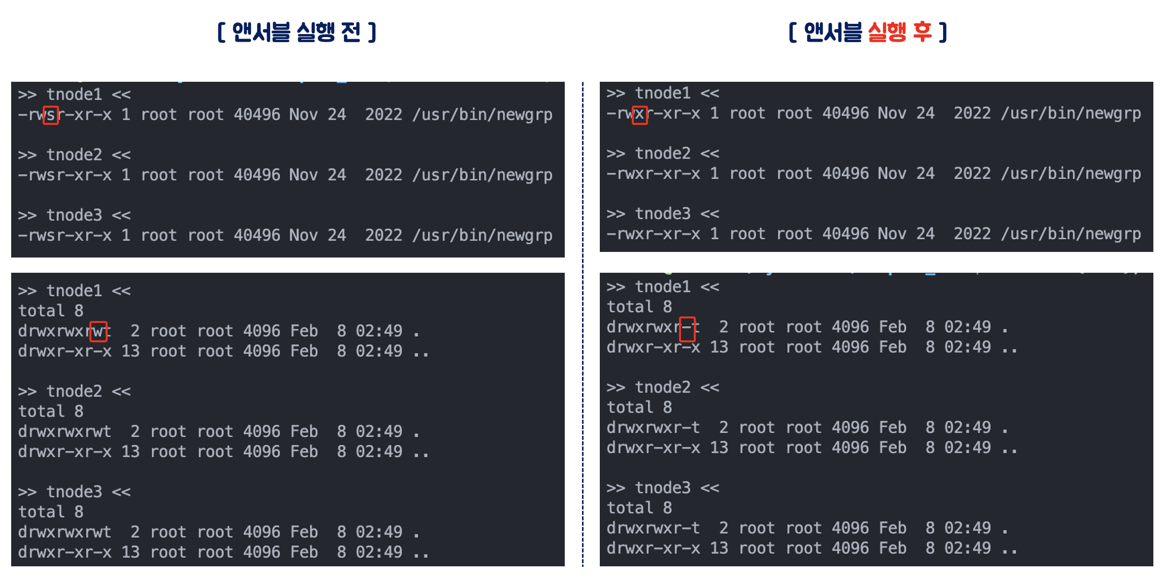 각 노드에서 발견한 Sticky bit 파일 목록과 World Writable 파일 목록, 해당 파일 권한이 수정된 것을 확인할 수 있습니다.