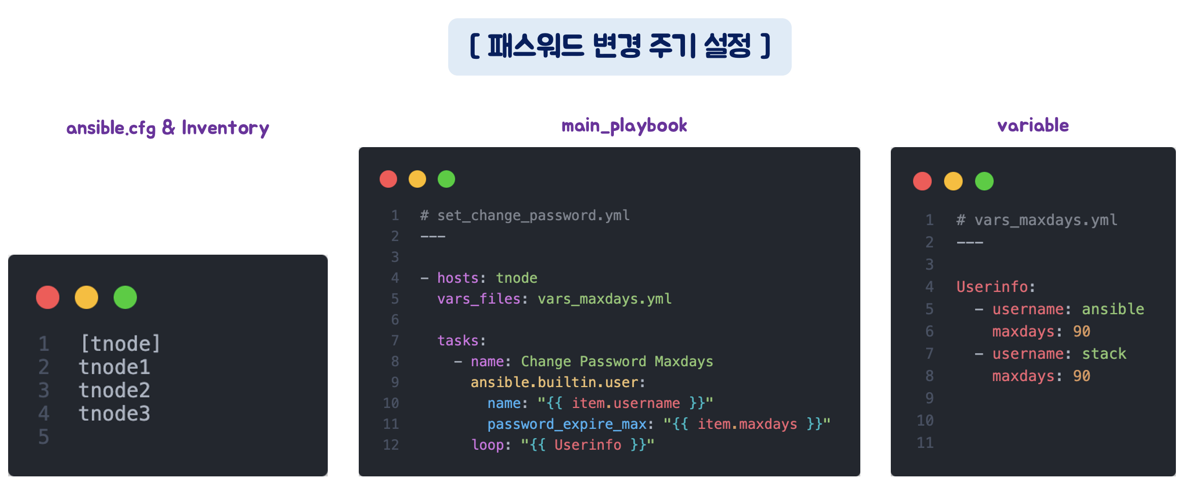 - 패스워드 변경 주기를 설정할 사용자 계정 정보와 최대 변경일은 변수를 통해 별도의 파일로 정의한다.