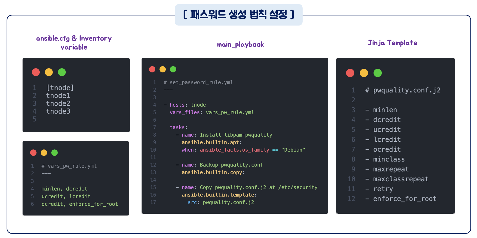 - pwquality.conf 파일은 사용자가 커스텀으로 설정하는 파라미터들로 구성되어 있으며, Jinja2 템플릿 방식으로 구현한다.