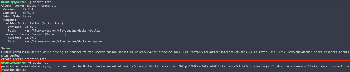 이는, 일반 사용자가 docker socket 에 대한 접근 권한이 없기 때문입니다.
