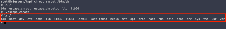 이후 다시 chroot 명령어로 접근하고 ls 명령어로 루트 디렉토리를 살펴봅니다.