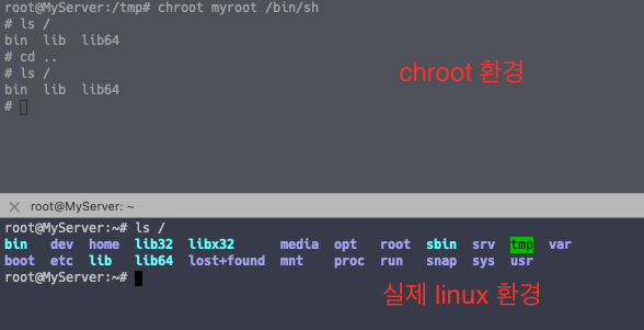 테스트를 하기 위해 /tmp/myroot 라는 디렉토리를 만들고, 해당 디렉토리를 chroot 로 설정하겠습니다.