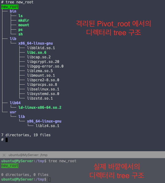 이후, 격리된 pivot_root 와 바깥 루트계정에서 동일한 pivot_root 디렉토리를 바라보게 되면 다른 파일시스템을 바라보고 있다는 것을 알 수 있습니다.