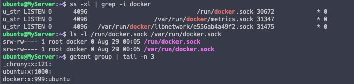 이 docker 그룹은 docker socket 에 대한 접근 권한이 있기 때문에 일반 사용자들을 해당 그룹에 넣어주면 docker 에 대한 접근 권한이 부여됩니다.