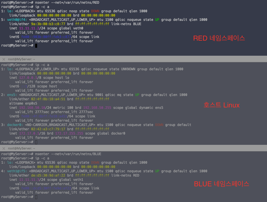 # RED , BLUE 네트워크 네임스페이스 생성