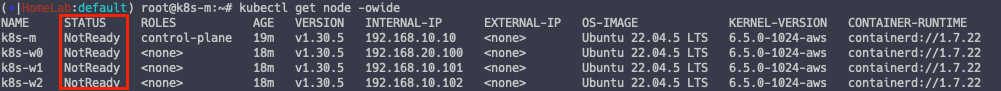 현재 쿠버네티스에는 CNI 가 설치되어 있지 않기 떄문에, Node 의 상태가 NotReady 로 표시되고 있습니다.