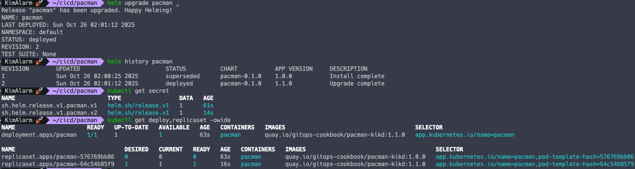 배포된 파일에서 컨테이너 이미지를 변경하고 업그레이드를 하면 어떻게 되는 지 확인해보겠습니다.